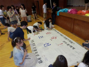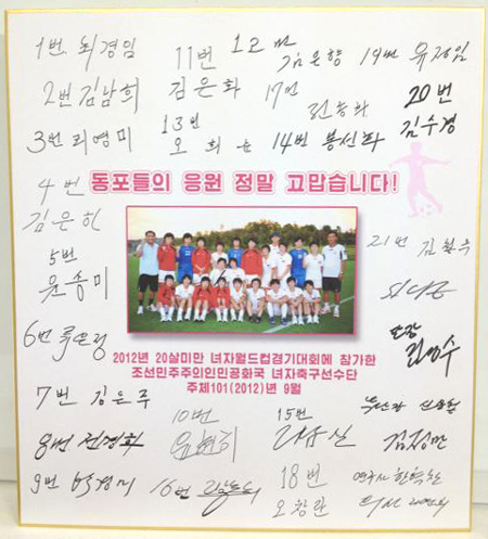 予選通過で興奮冷めやらぬ29日、関東地方の留学同各本部(東京、西東京、神奈川、埼玉)の学生たちがさいたまスタジアムで練習中の選手たちを訪ねました。しばし練習を見学し、「マダン2012」の参加者全員のメッセージを書いた横断幕を手渡しました。選手たちは慣れない猛暑やロンドン五輪直後からのあわただしいスケジュールにもかかわらず、同胞学生たちの思いが詰まった横断幕に喜びを示し、一緒に記念写真を撮ってくれました。(横断幕はホテルで選手たちがいつでも見られるように飾ってあったそうです。)