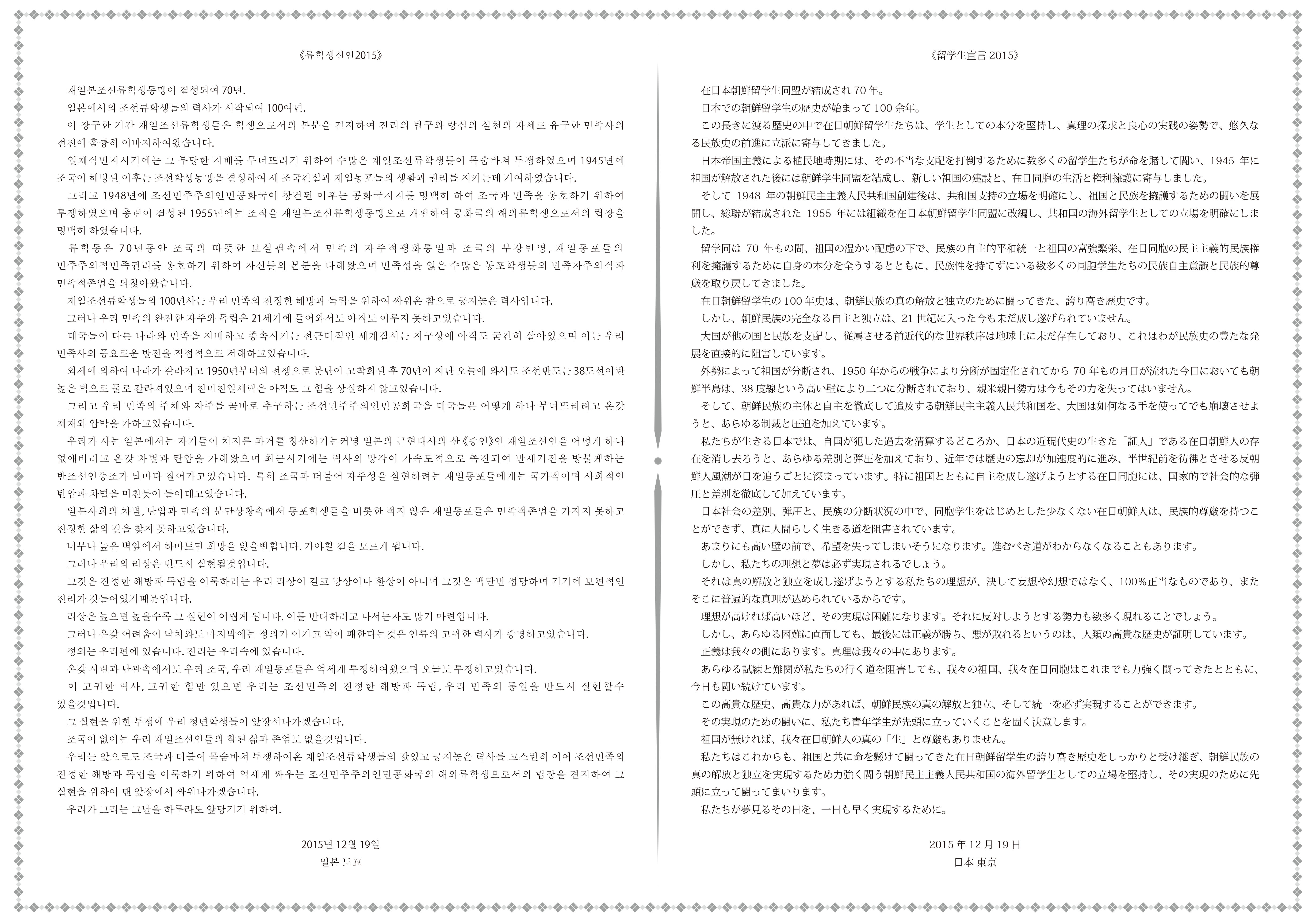 私たちはこれからも、祖国と共に命を懸けて闘ってきた在日朝鮮留学生の誇り高き歴史をしっかりと受け継ぎ、朝鮮民族の真の解放と独立を実現するため力強く闘う朝鮮民主主義人民共和国の海外留学生としての立場を堅持し、その実現のために先頭に立って闘ってまいります。